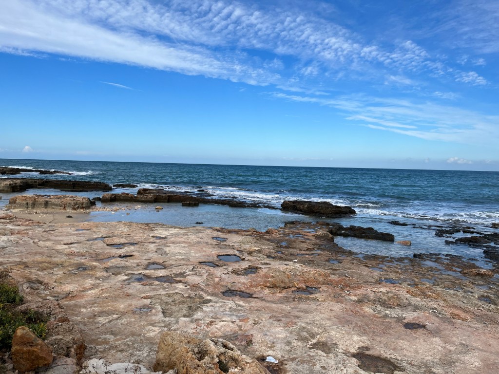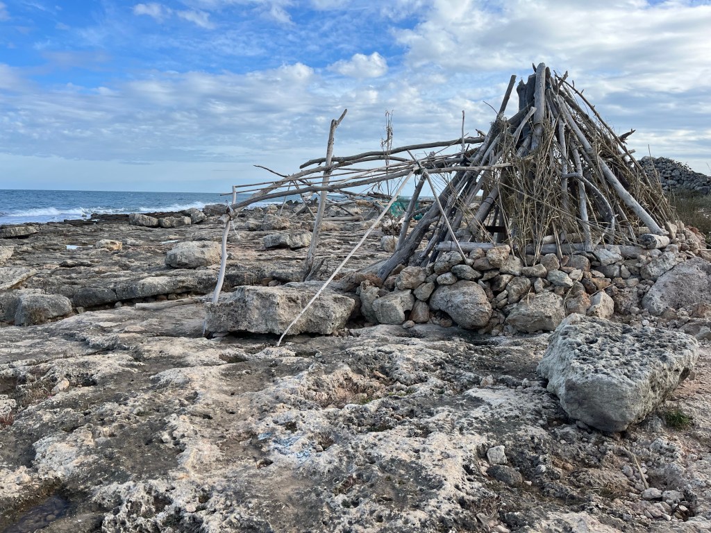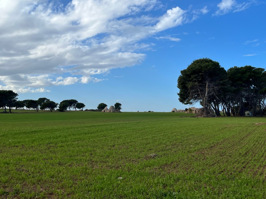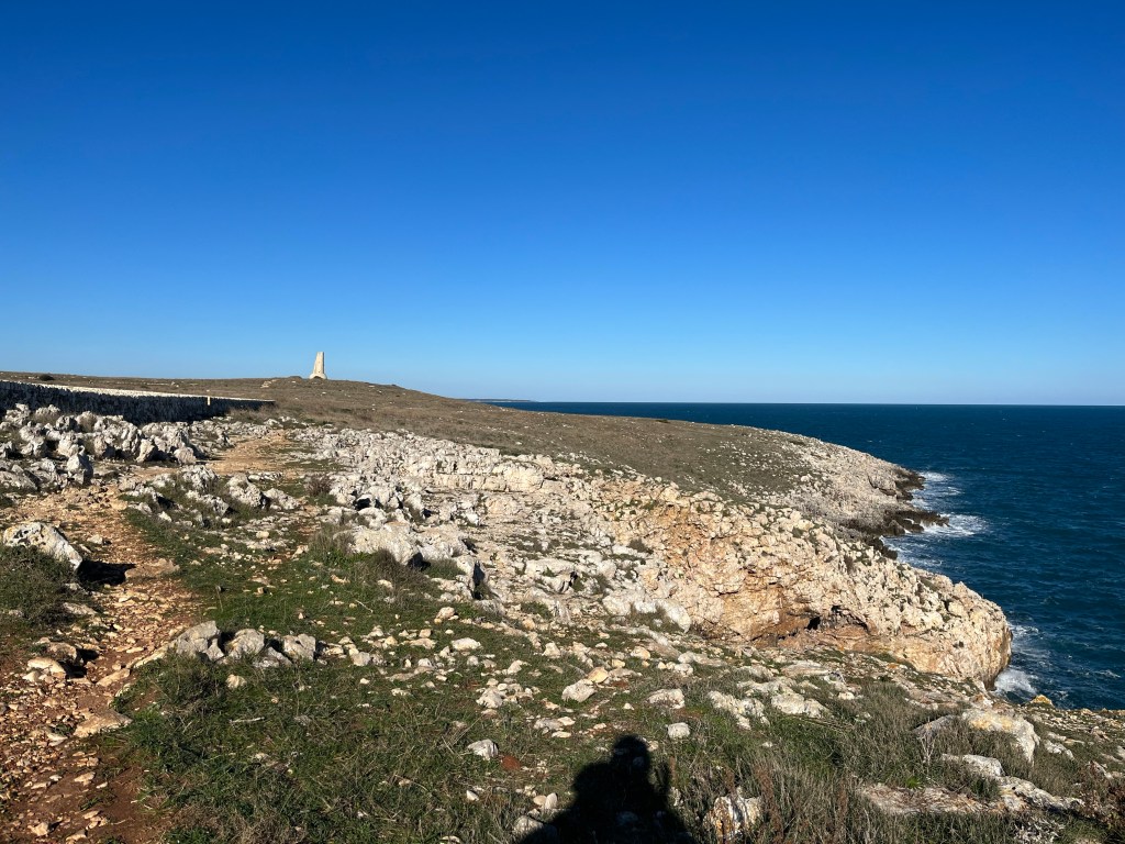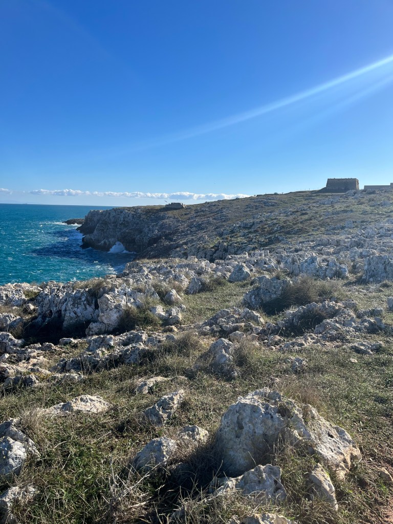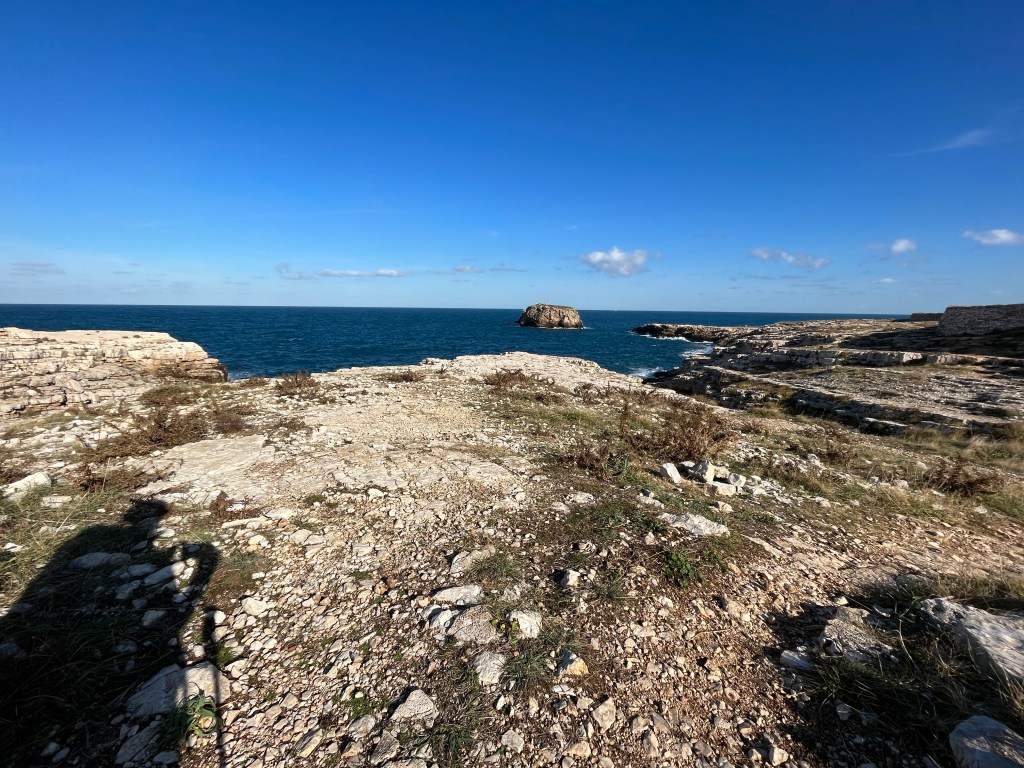 The path follows a long stretch adjacent to the coast, with largely easy walking on paths, but with plenty of places to explore. In the parklands behind the beach there are many trulli ruins; though we stick to the beach, we do see a group of people emerge from the area of the ruins.