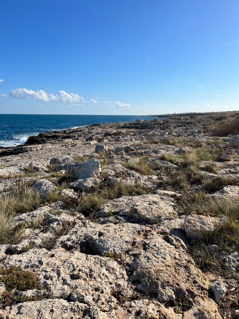 The first cove in particular is a challenge. We leave Polignano a Mare by the scenic promenade, soon arriving at a fence in our way – you cross this with a stile. We follow what we think is the path through the grass and rocks, but find ourselves on the other side having to scramble up loose rocks, amongst the weeds and prickles – and I hate rock scrambling. Maybe we chose the wrong path through the grass; maybe there was an easier route out, but we could not see it.