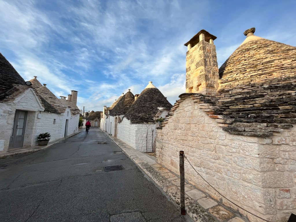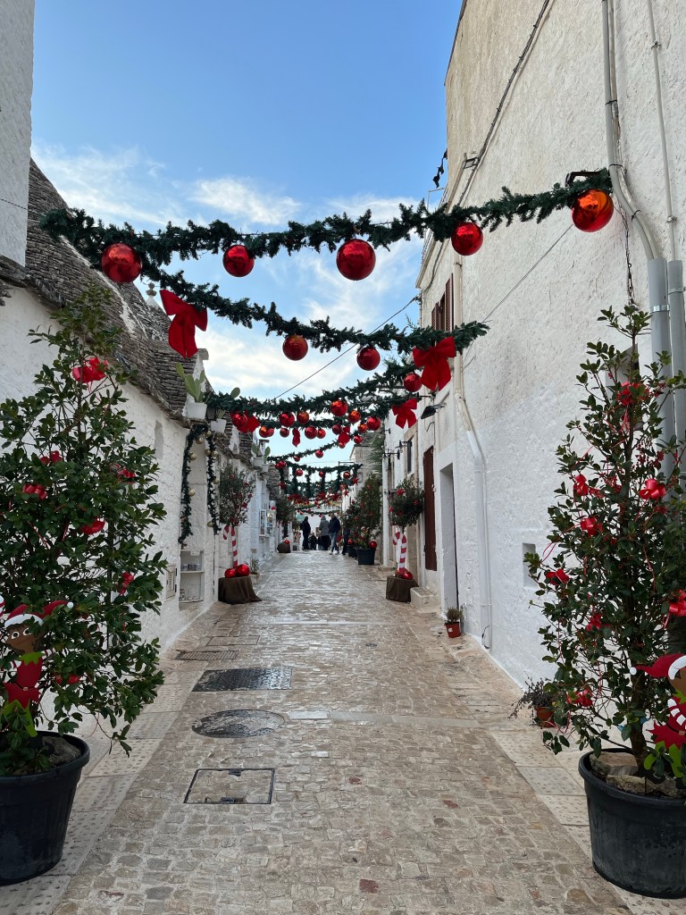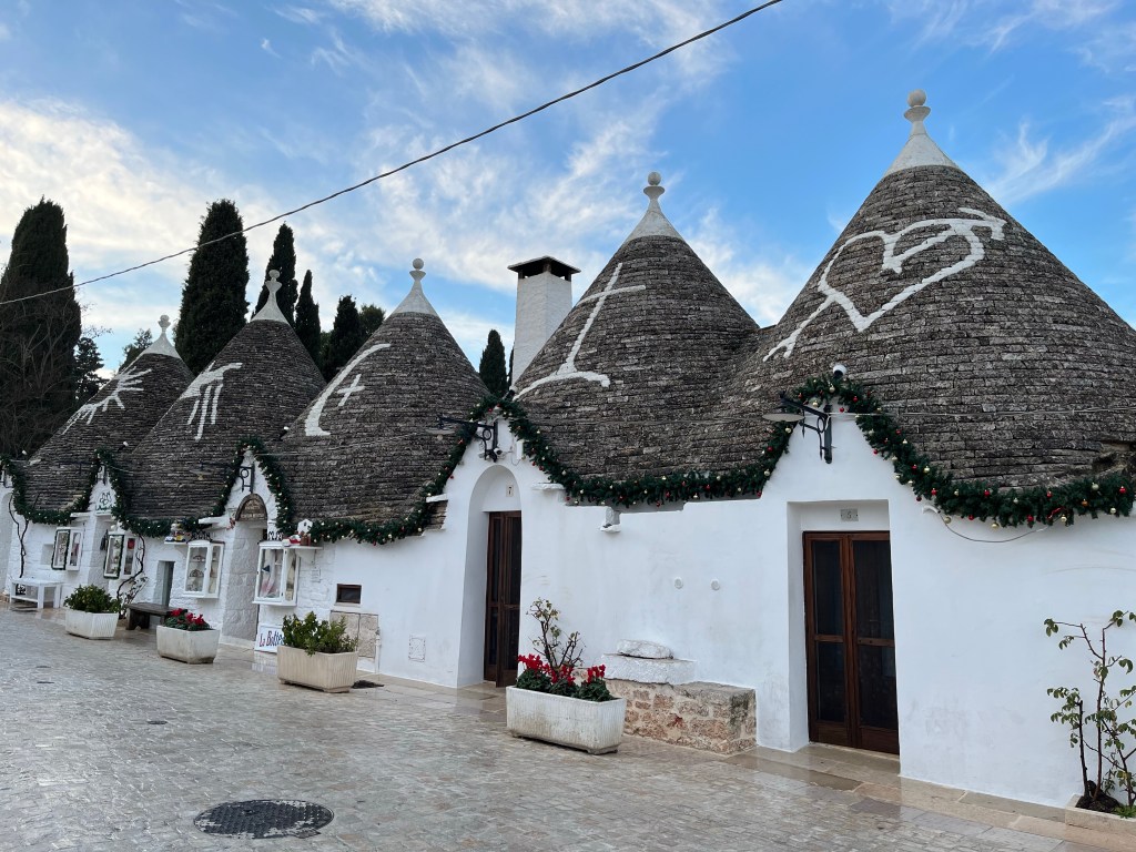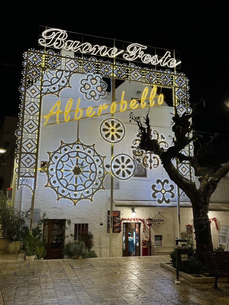 After catching the bus from Monopoli (a really scenic, circuitous route that climbs up from the coast to the Valle d’Itria) we managed a bit of a tourist visit to Alberobello without the large crowds common to this town. In between the afternoon and evening rain, we hit the streets along with the other few visitors, everyone waiting their turn for photos and in turn moving aside. I can certainly see the appeal of this town, and it’s unique housing. Christmas decorations are still being set up, and some of the shops and eateries are open – with a long weekend ahead it will probably fill up more than today.