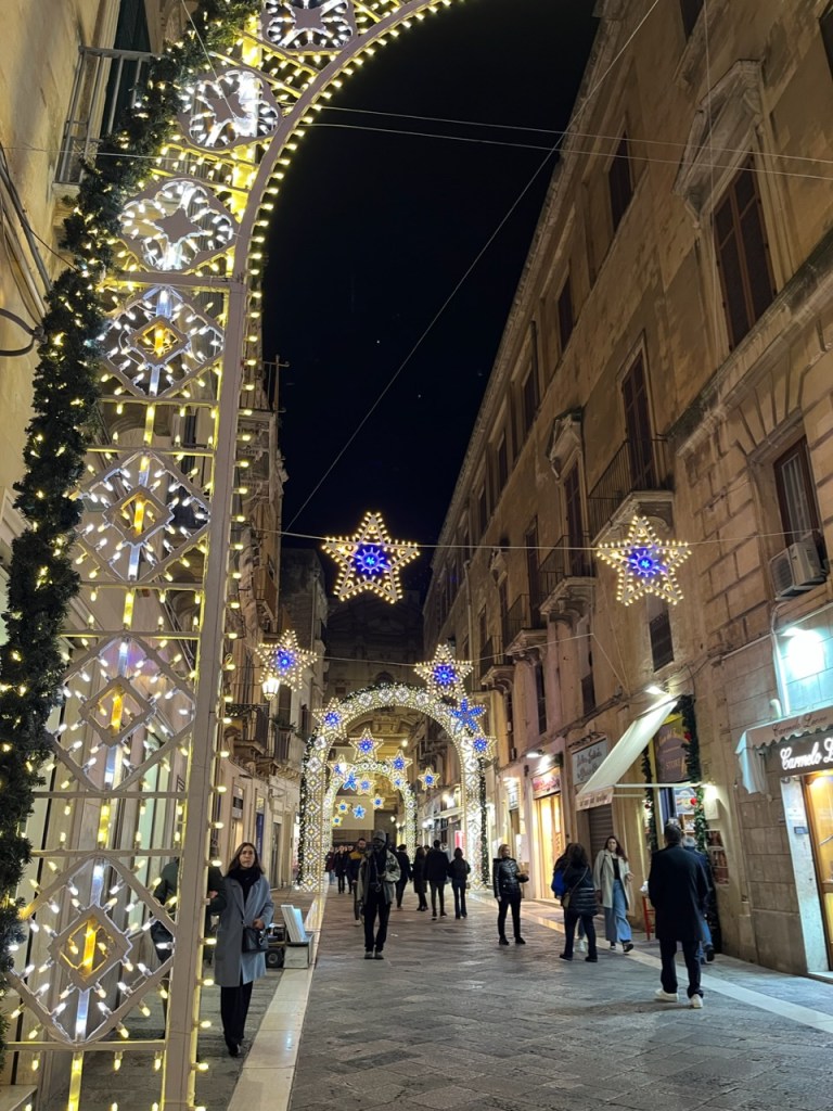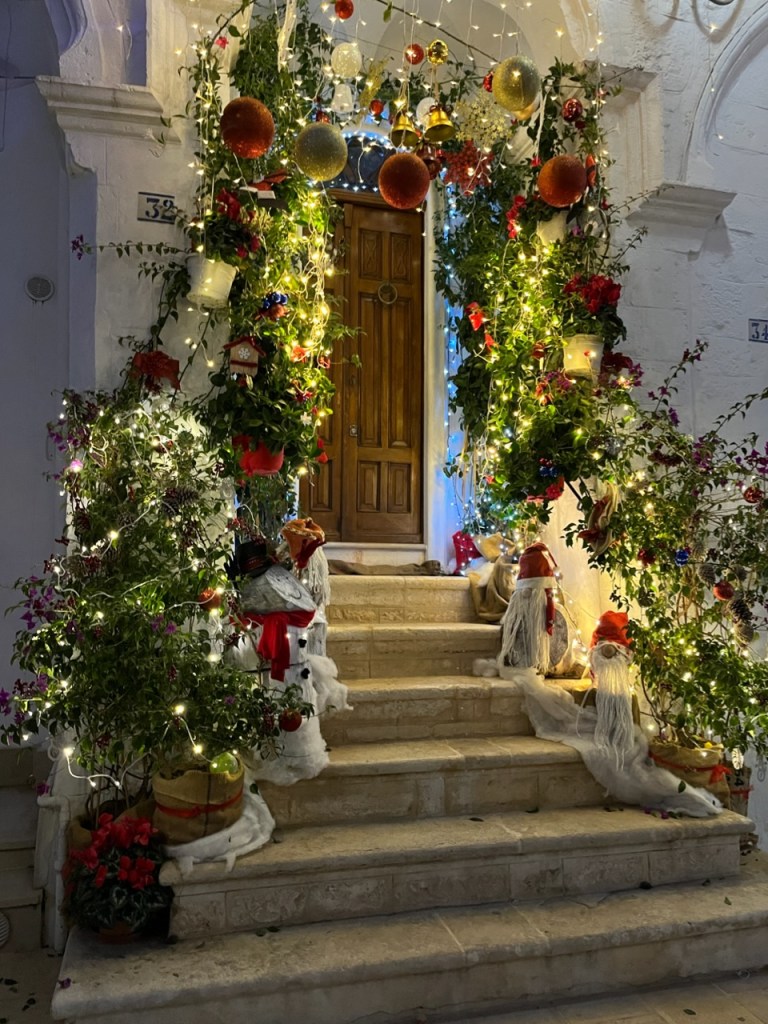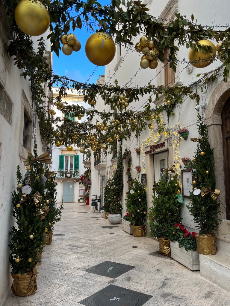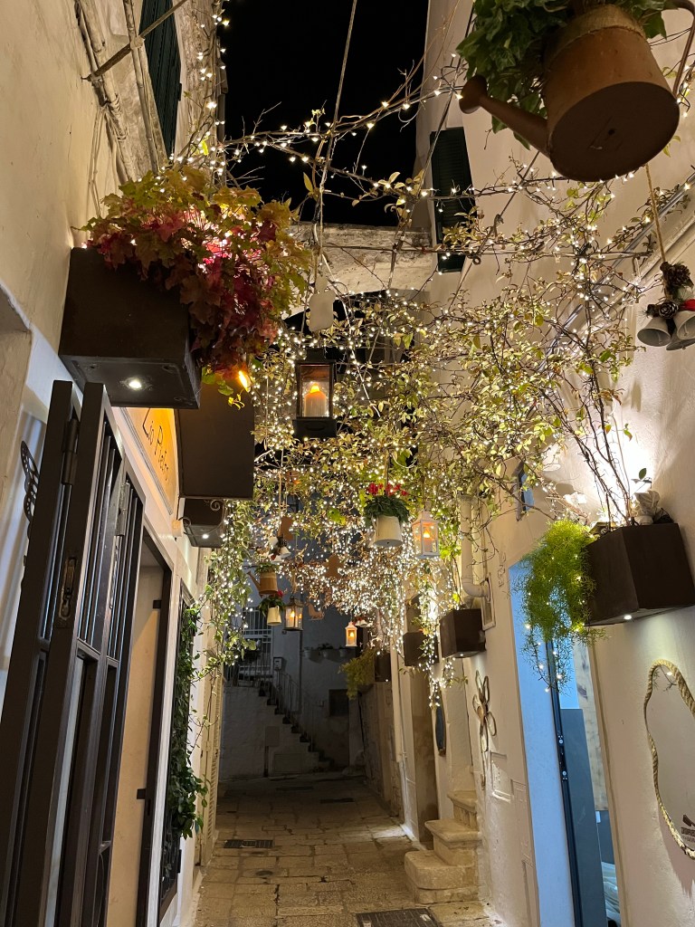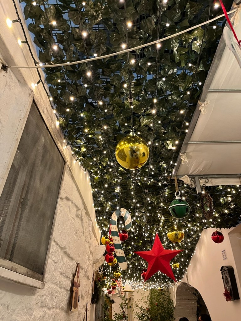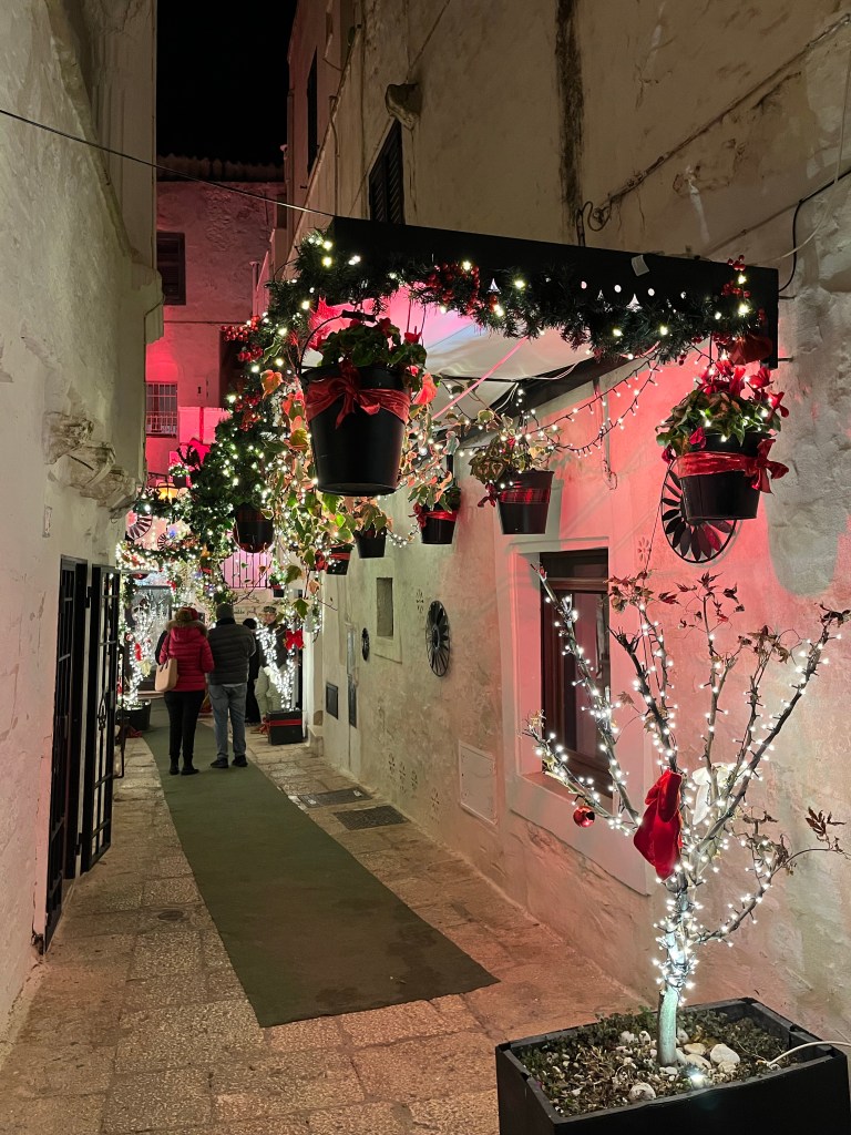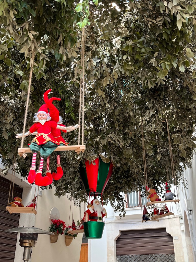 One of the reasons I chose this inland route is the time of year – the towns of the Valle d’Itria love their Christmas decorations, and Locorotondo is well known for their commitment. We can both be a bit bah-humbug about many aspects of Christmas, but we find we are not even annoyed by the piped Christmas carols, and are enchanted by the decorated streets. With the town full of visitors on this long weekend, it is a very crowded evening passeggiata and the restaurants and bars are bursting at the seams (got some lucky quiet moments with the following pics).