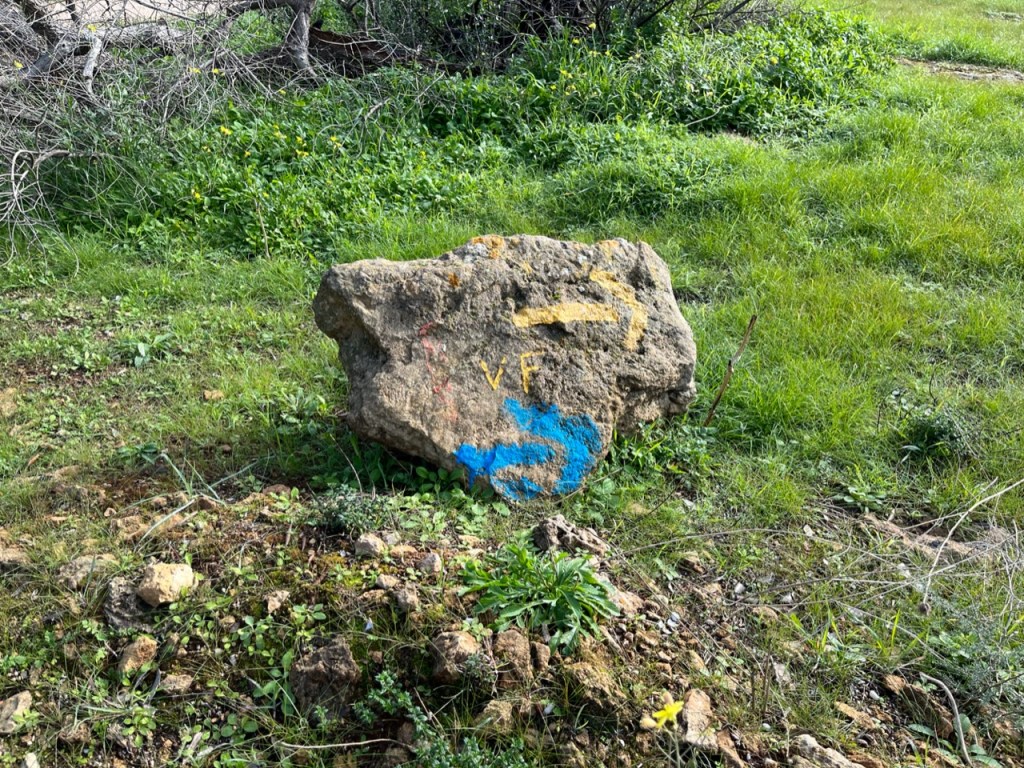 It takes about 50 minutes through the streets until we arrive at the first of the fields. All the fields today are sodden, with often a lot of surface water to be seen. We are frequently negotiating water on the path; we pass a number of areas where there has been recent, and current work, to improve the drainage. There is not a lot of interest in the first couple of hours, but this trail does pick up from about the 7km mark when we return to the vines and olives. Following a path around the vines we spot shell fossils in the rocks.