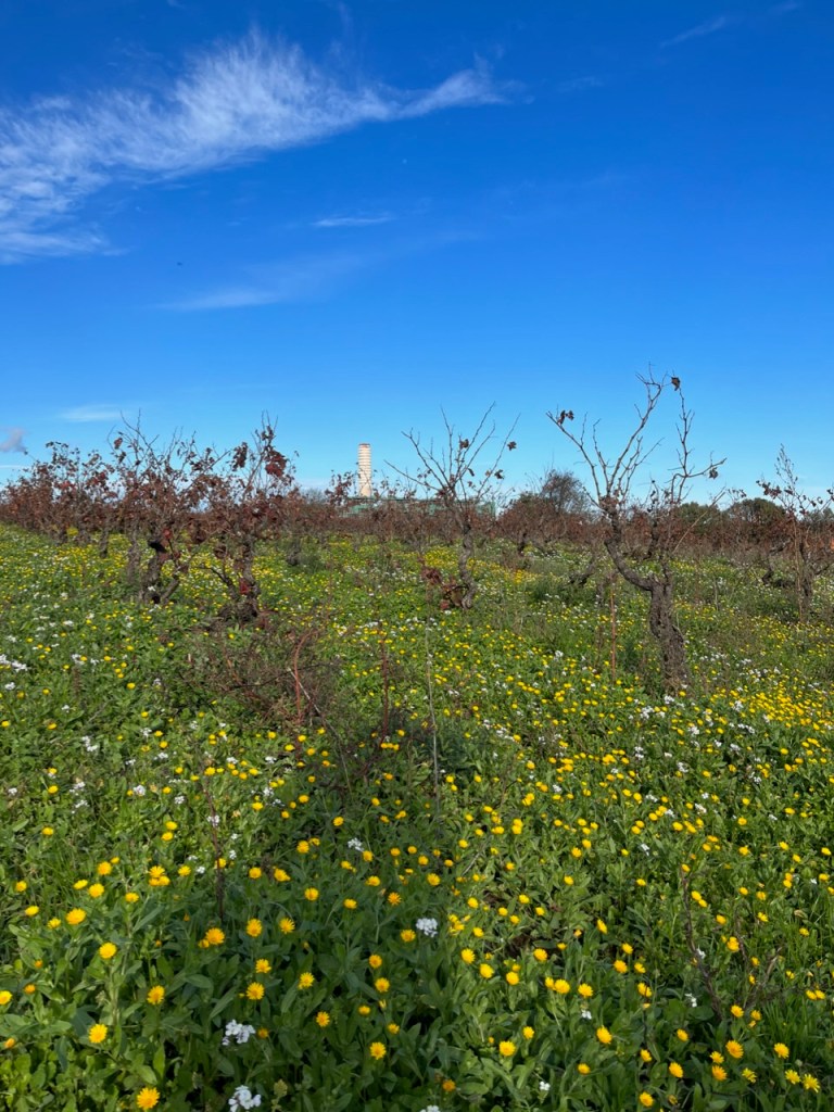 The route then cuts inland, passing under the freeway to return us to the colourful fields of vines, olives, and vegetables – lettuce, parsley, cabbages, and artichokes. It is easy walking.