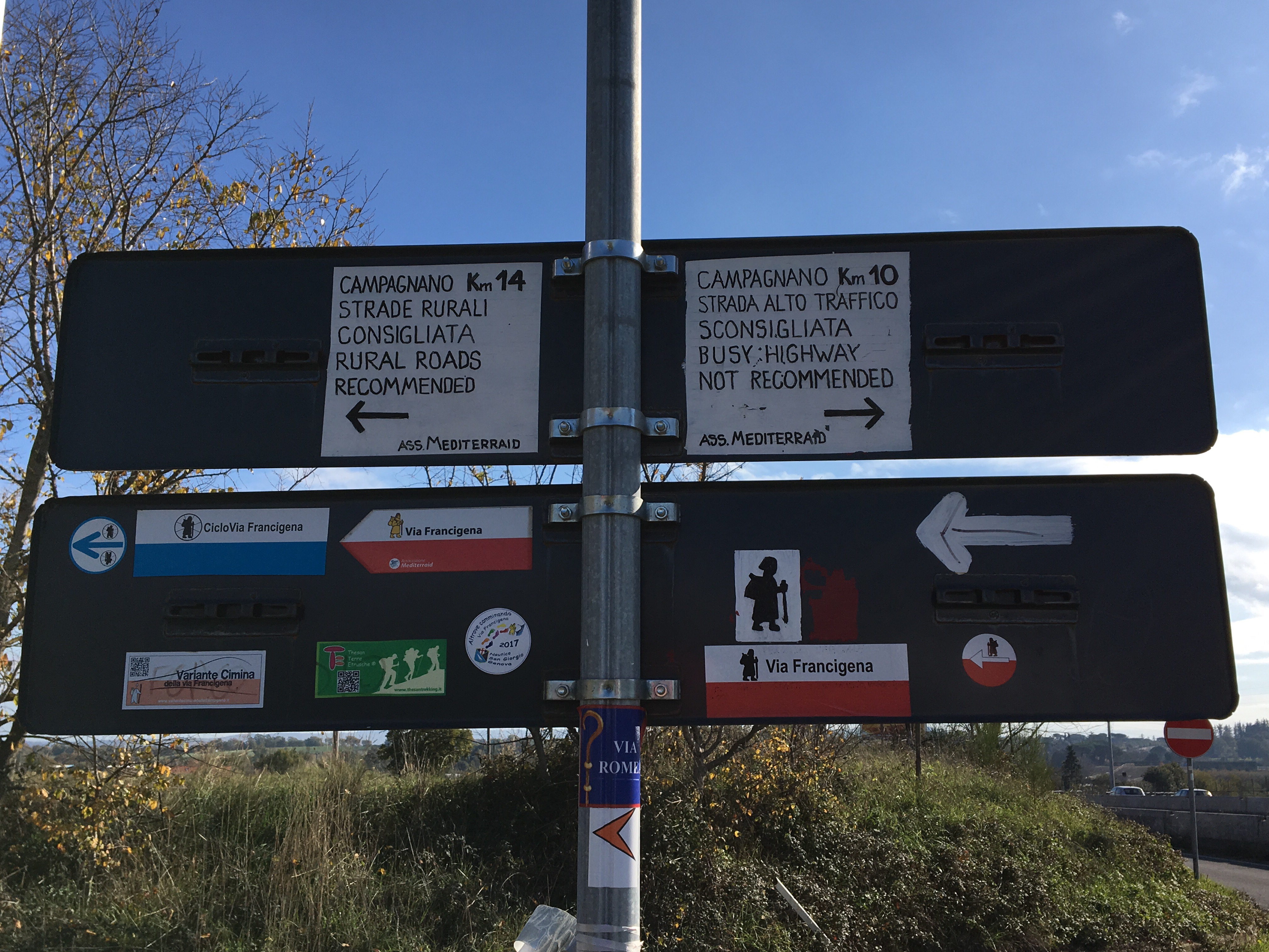 We make pretty good time early on and arrive at Monterosi for a break. After crossing the via Cassia by overpass (it is now an 8 lane highway) we are then on rural roads for the rest of the day.