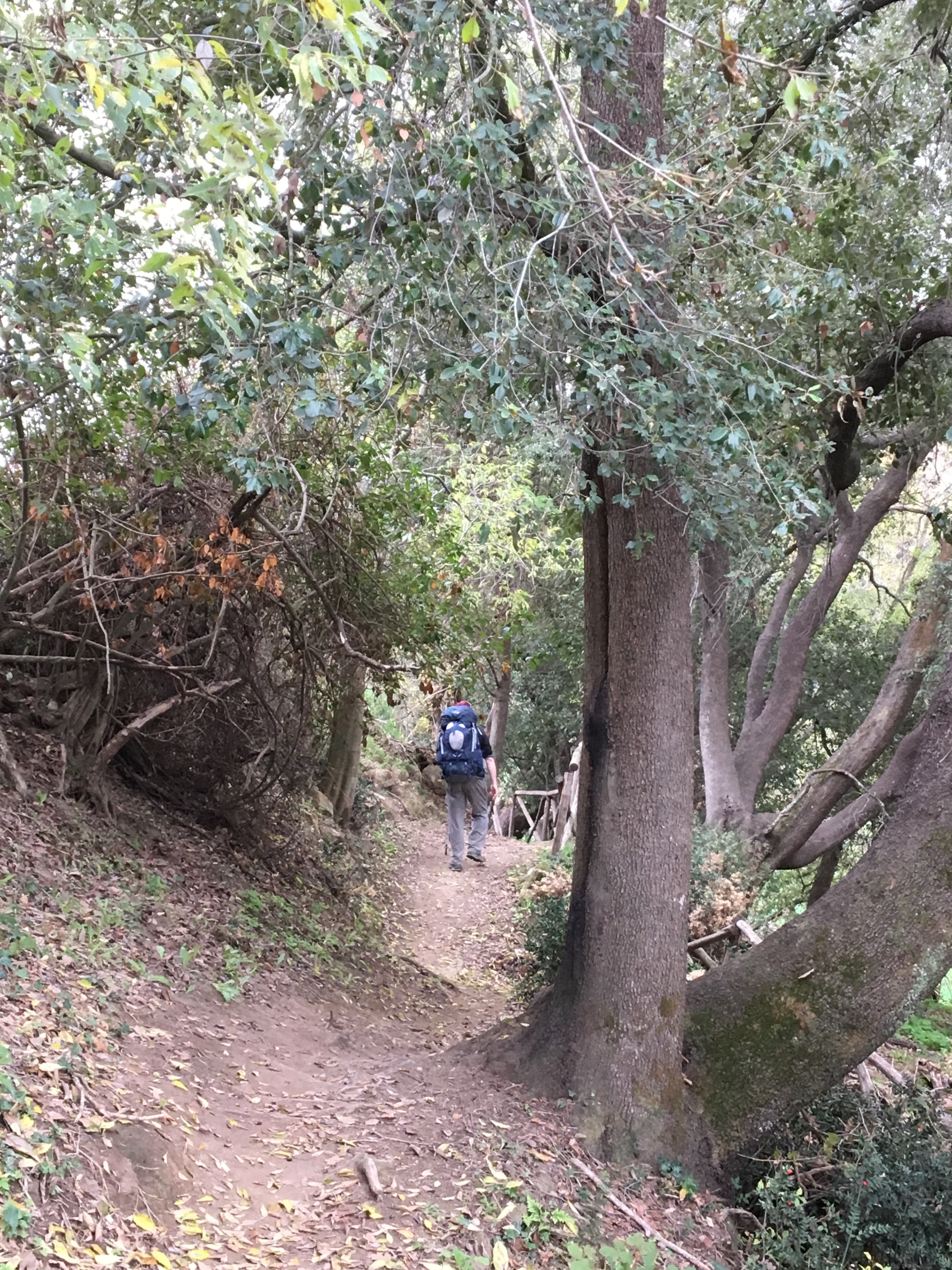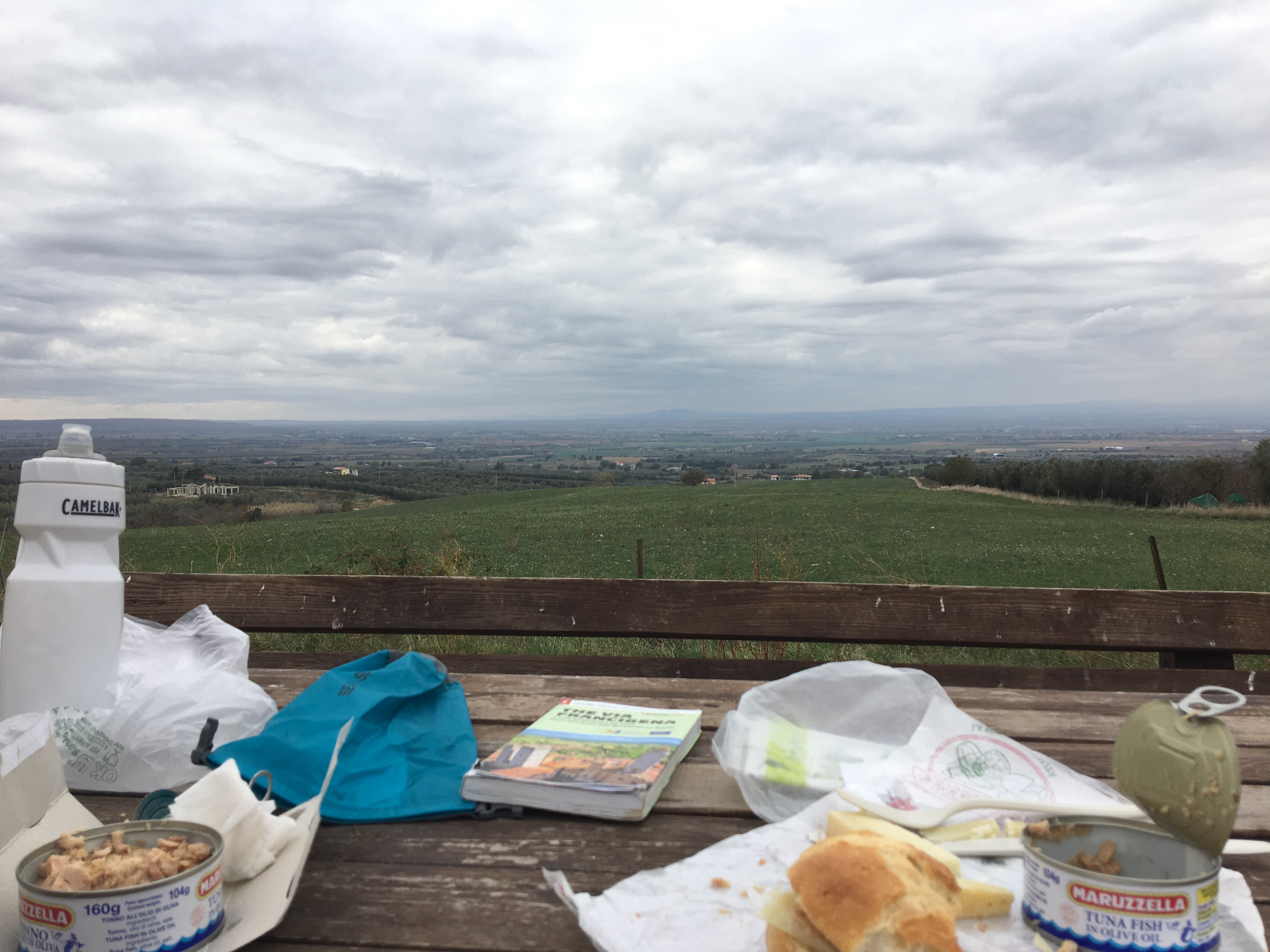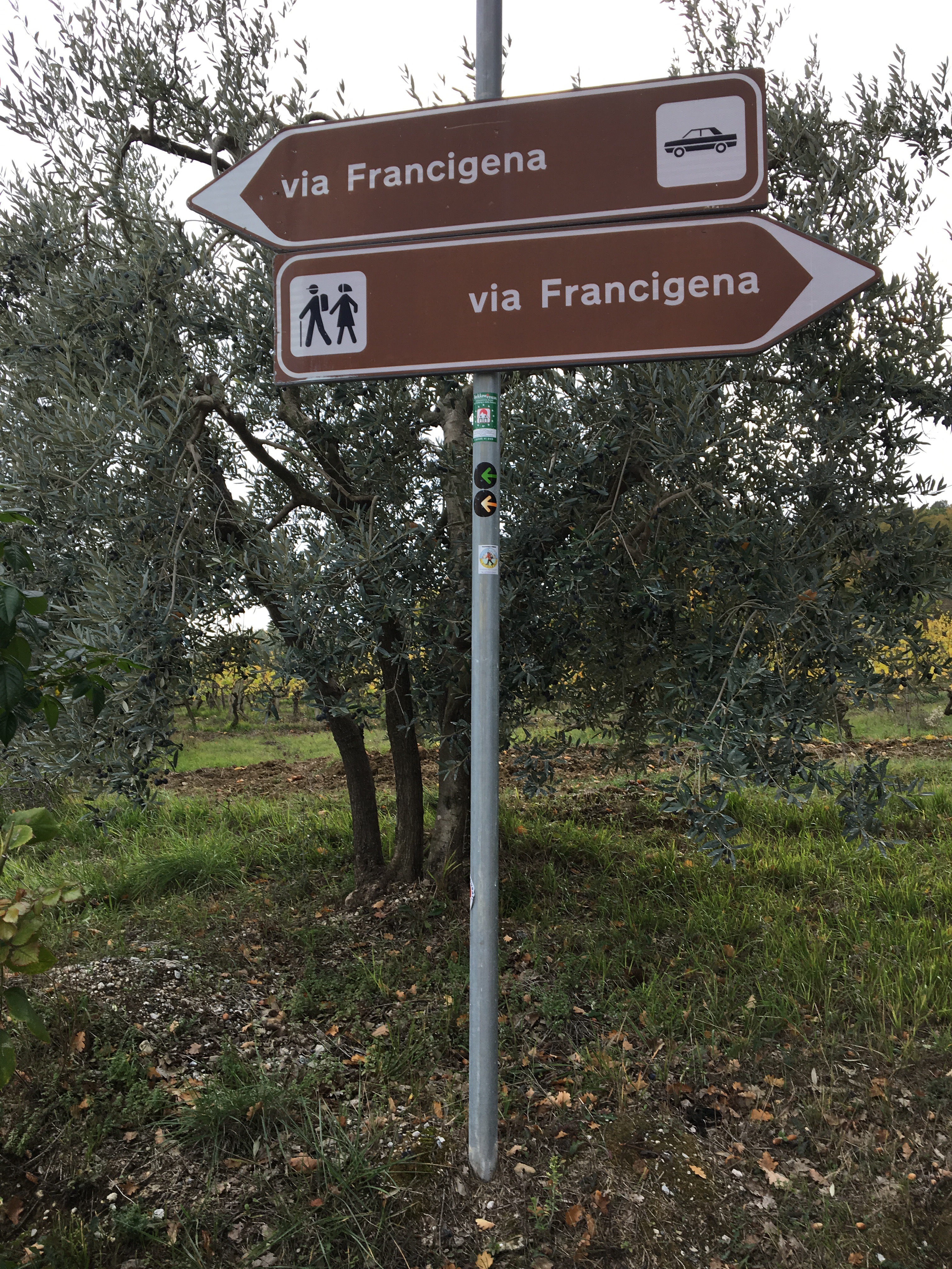 I see a walker ahead, two sticks and a backpack just visible; as it is highly unlikely that we would be catching up with anyone currently, we assume they are coming towards us. Pellegrino italiano arrives, clothes and backpack matching azzurro. Last year he worked for a while in Melbourne, and described how much he enjoyed that time, and the city. We share the challenges of trying to speak another language, the impact of different colloquialisms, dialect, accents, and mumbling young people. He describes how many people do not speak proper Italian as it is quite challenging; we tell him how we watch some English/Irish/Scottish/USA tv programmes with subtitles otherwise we cannot follow.
