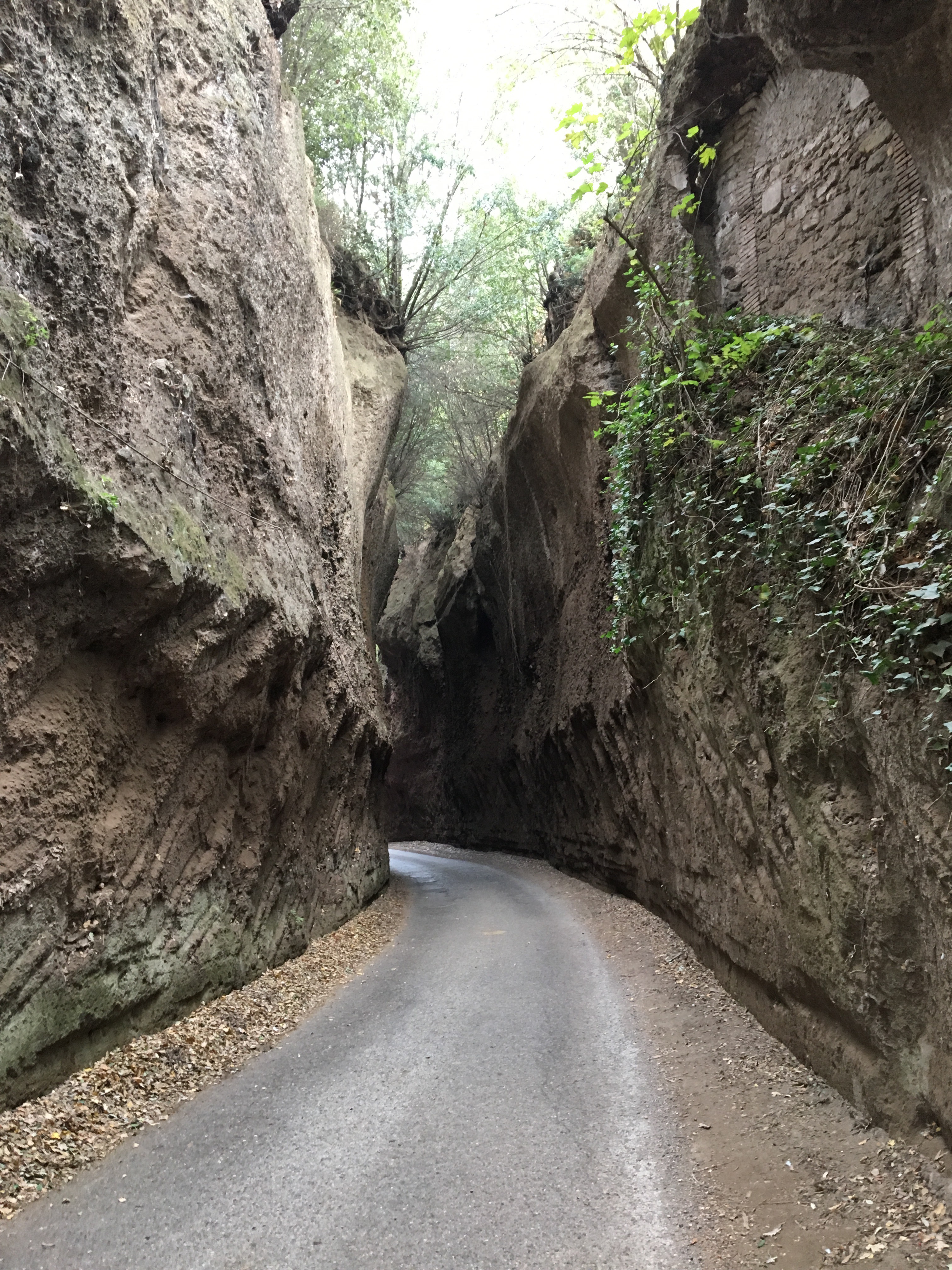 You then pass under an arch over the road and it is then all downhill. Steeply. The road now quickly narrows, from just able to get two cars carefully past each other, to just get one average-sized car between the high walls. When three cars come from one direction, and only one from the other, the one has to back up to reach a driveway, drive in there and let the three cars pass; we watch this dance happen a few times.