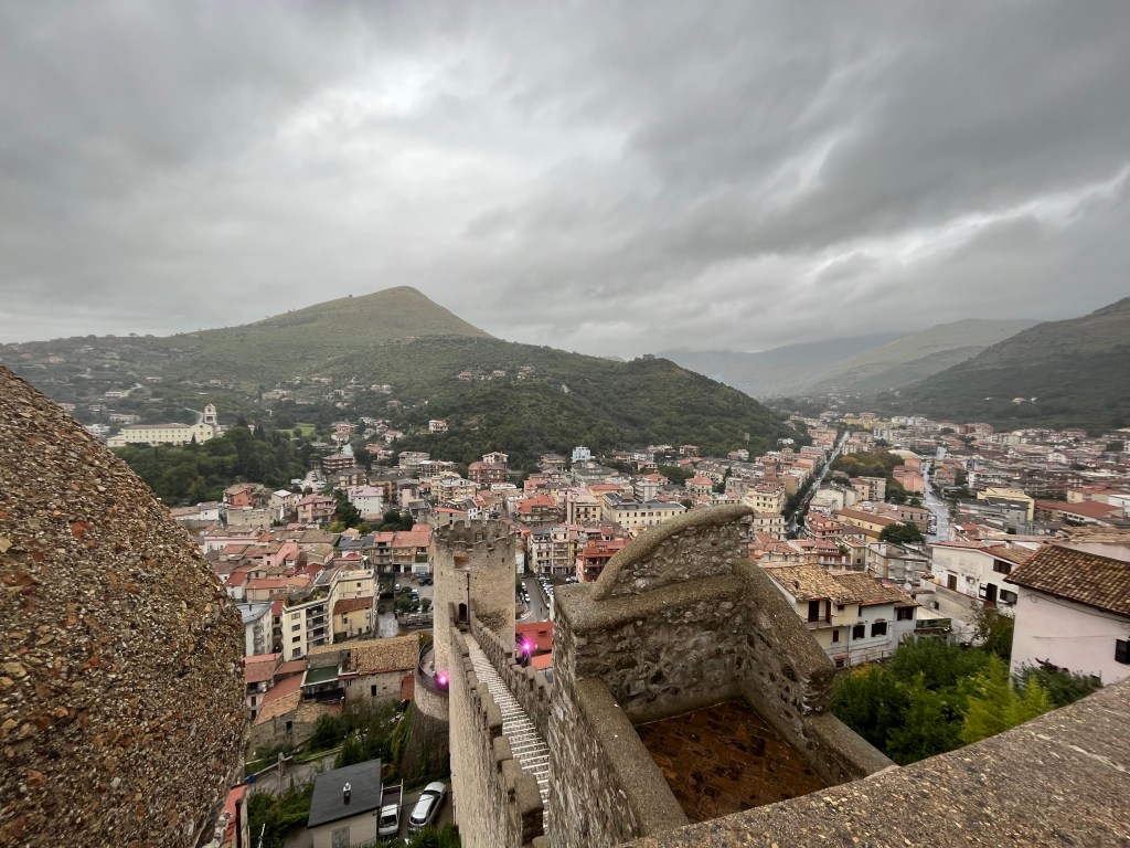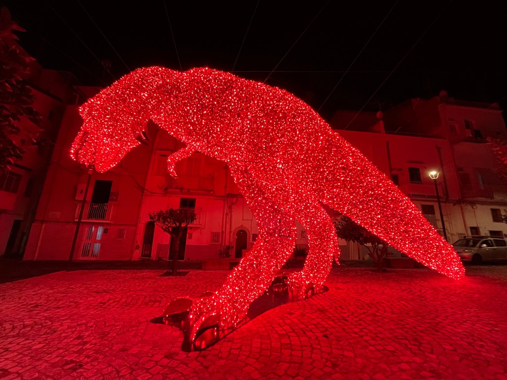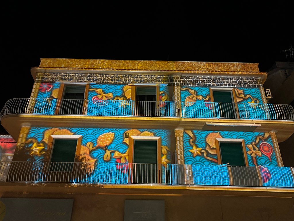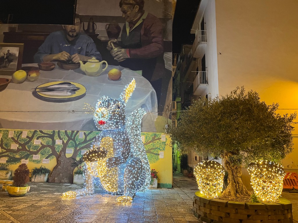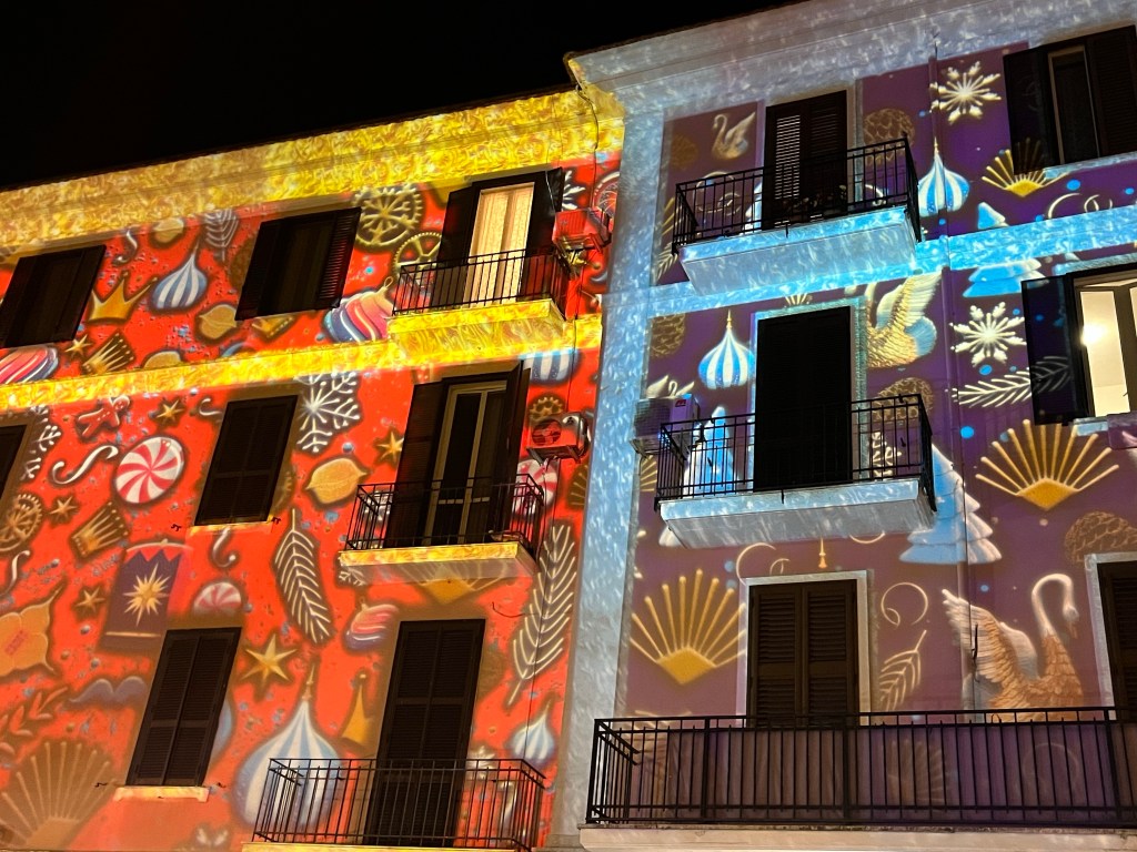Tonight we have seafood pasta at a nearby place, then go for a wander around the streets. The Christmas market is getting set up, along with an ice-rink. And the streets and buildings are lit up. The following morning, the woman organising breakfast says that Gaeta is definitely busy in summer, but it is also busy on winter weekends for the lights.
