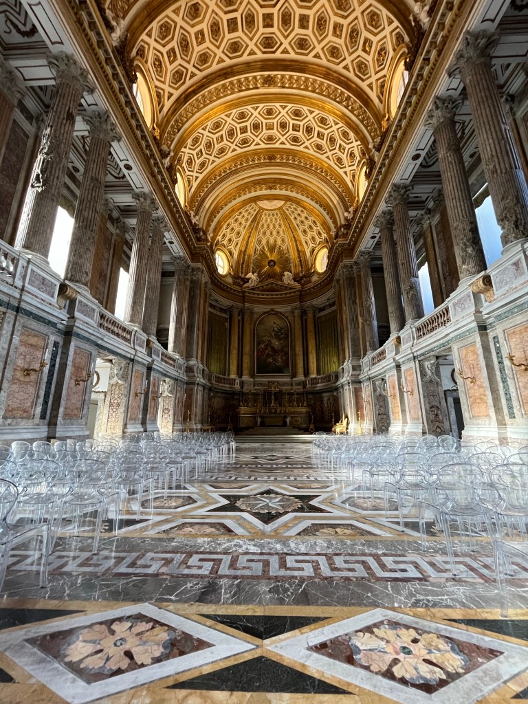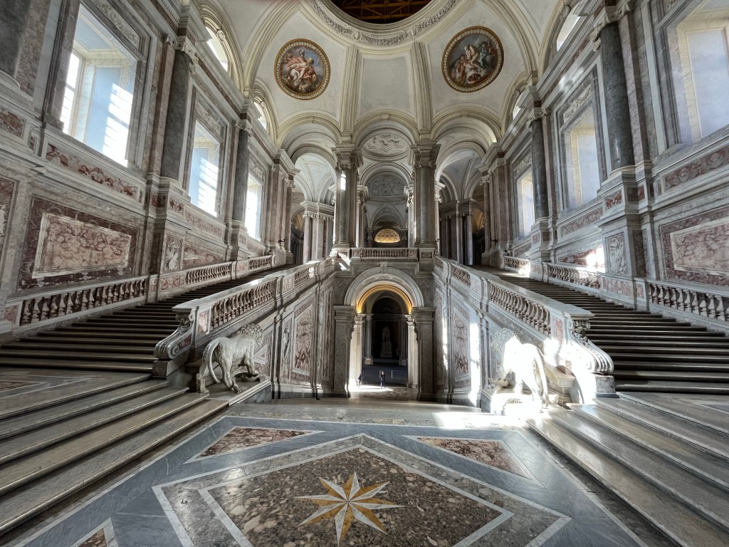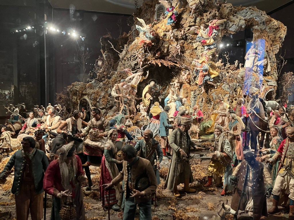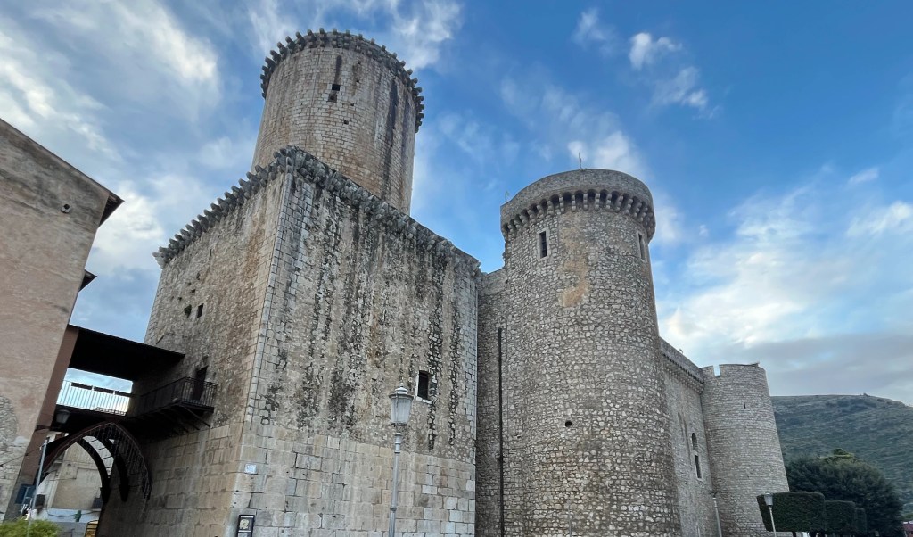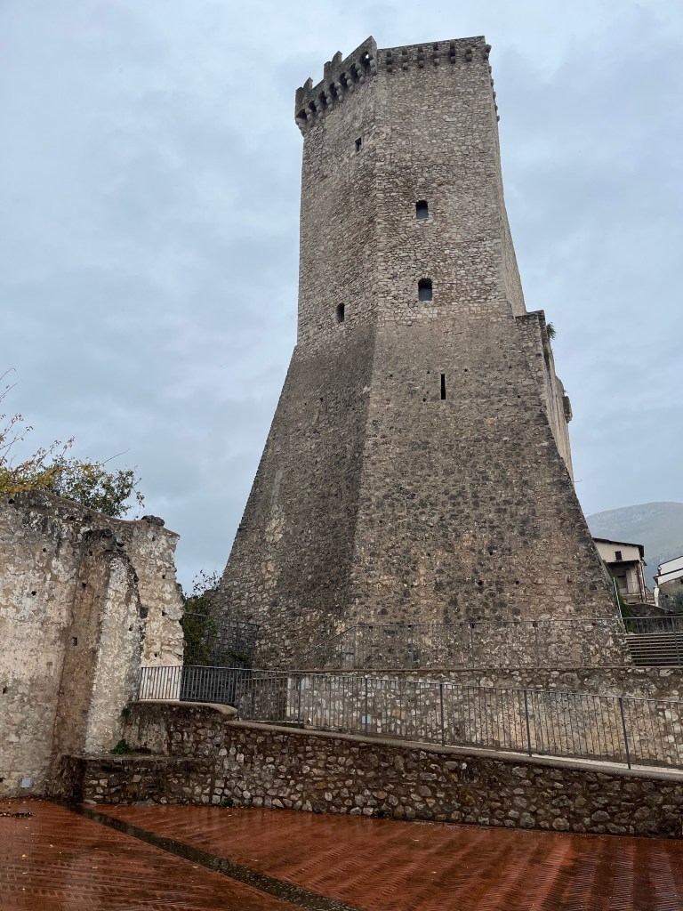 Tonight we have seafood pasta at a nearby place, then go for a wander around the streets. The Christmas market is getting set up, along with an ice-rink. And the streets and buildings are lit up. The following morning, the woman organising breakfast says that Gaeta is definitely busy in summer, but it is also busy on winter weekends for the lights.