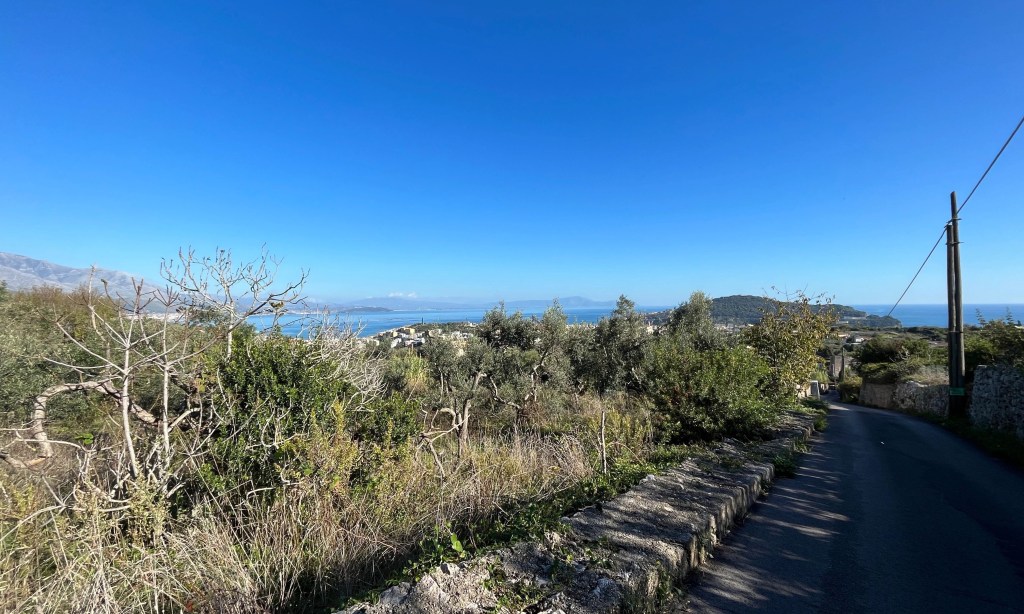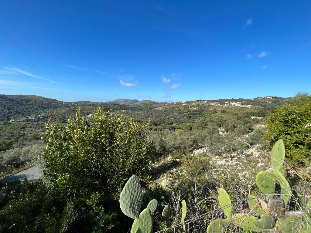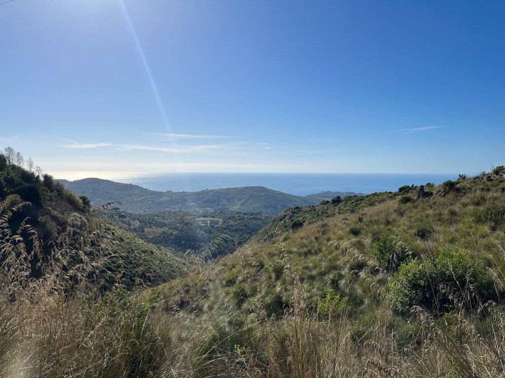 Back on our way, now largely level as the road continues around the hillside. After a second rest in the shade we find that we round a hill to take in the view towards the sea.