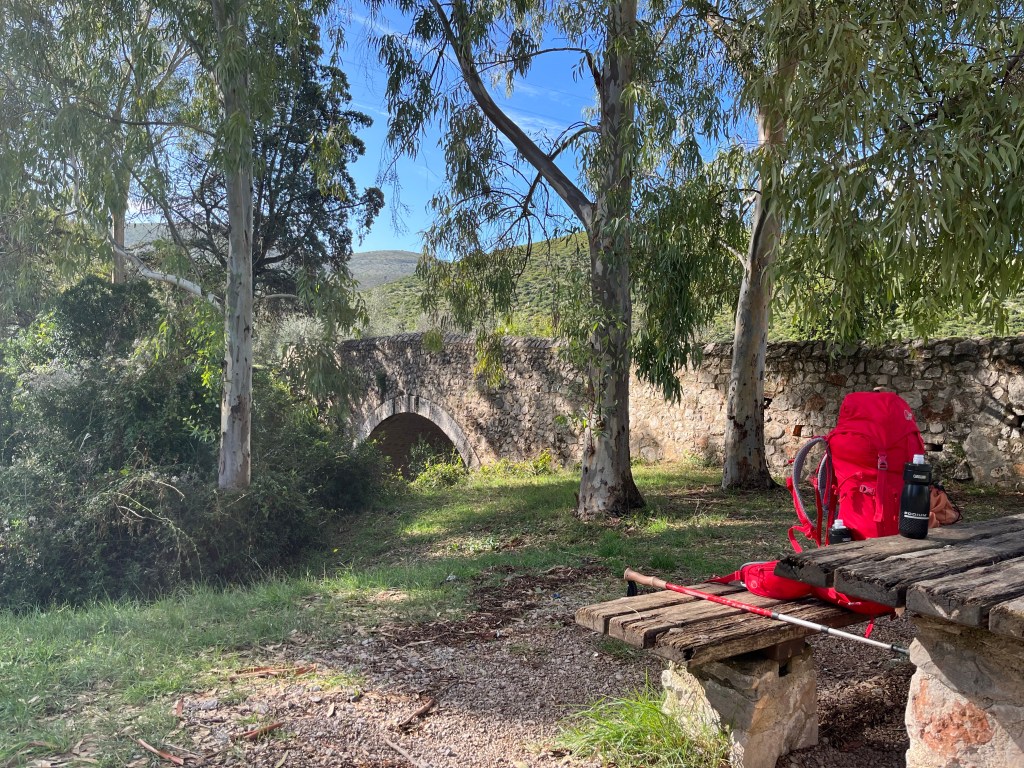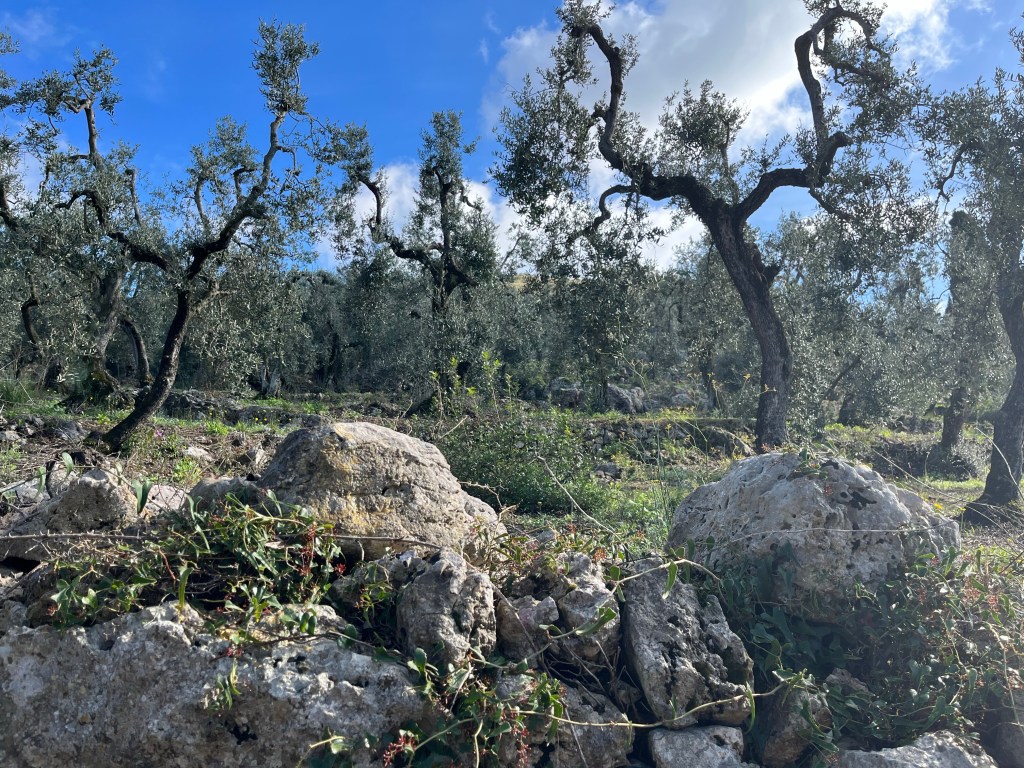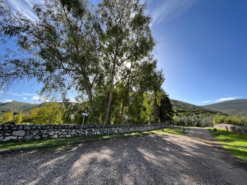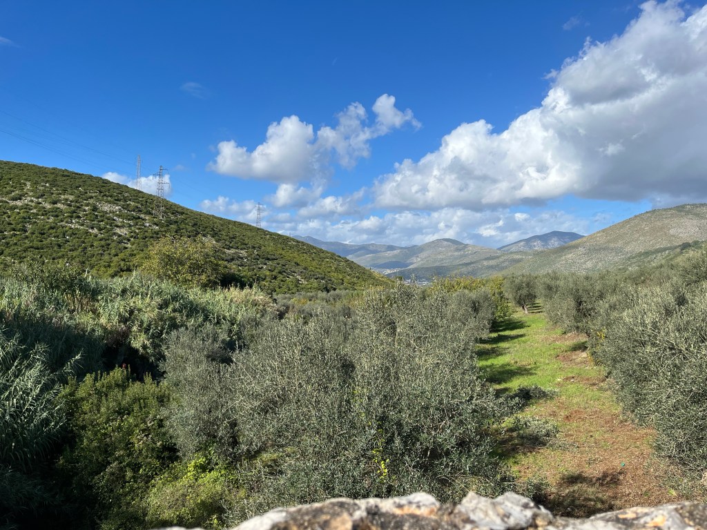 We are soon onto the quieter road which is still heading up. It takes us 30 minutes from leaving to get through the biggest climb of the day. We take advantage of a wall adjacent to an olive field on the side of a wider section of the road for our first break.