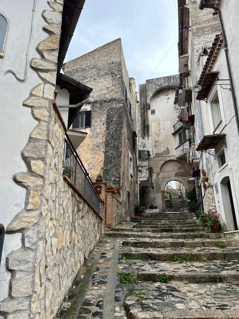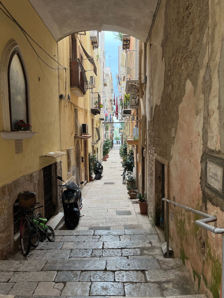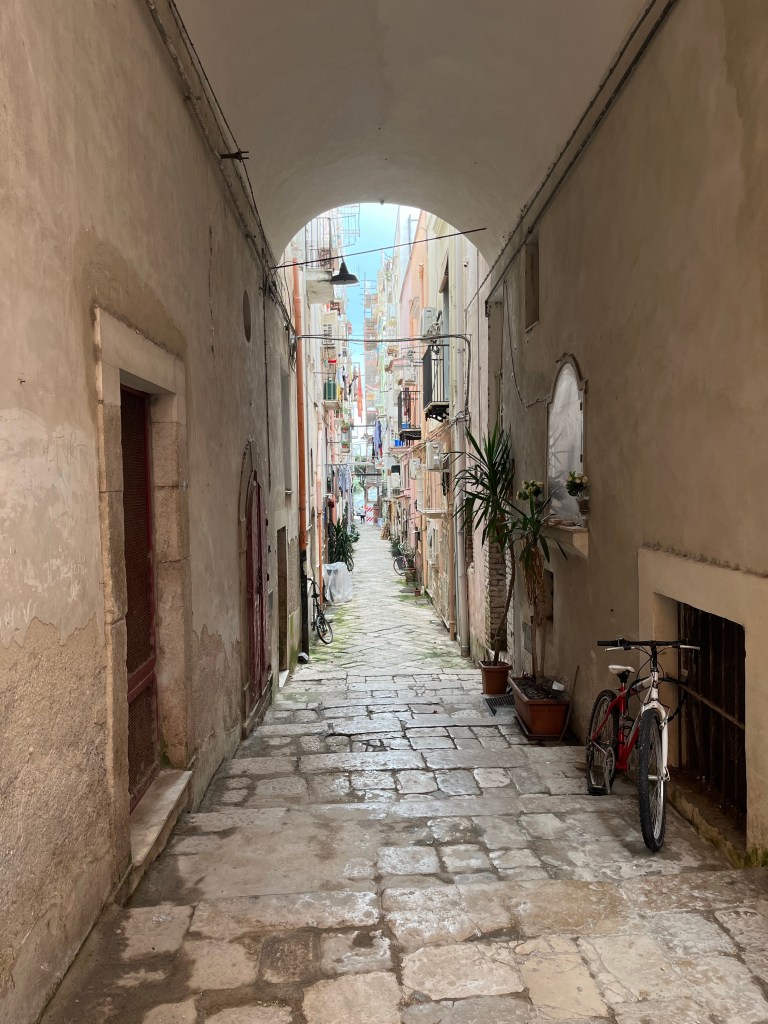 Following the route around the town, we arrive at our accommodation for the night, on the path towards Formia. This old section of Gaeta consists of tight, narrow pathways between the 4-5 storey homes and businesses with glimpses towards the bay – on this side the bay is not beach but boating.